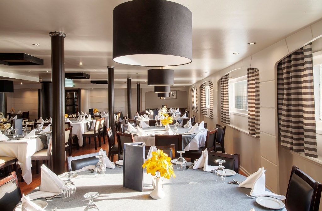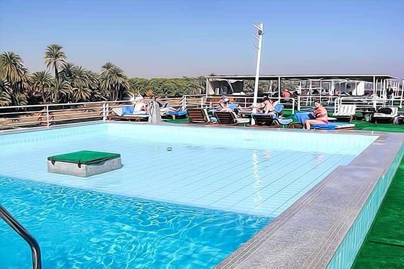 The Nile Style Nile cruise boasts two pools and a large sundeck This deluxe cruiser has striking and light modern design of the sweeping staircases and reception area fades into the relaxed ambiance of the on board bar and entertainment lounge.